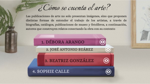 Las publicaciones de arte no solo presentan imágenes, sino que proponen distintas formas de entender el trabajo de los artistas, a través de biografías, catálogos, publicaciones de museo y fotolibros, a continuación, autores que construyen relatos conectando la obra con su contexto
