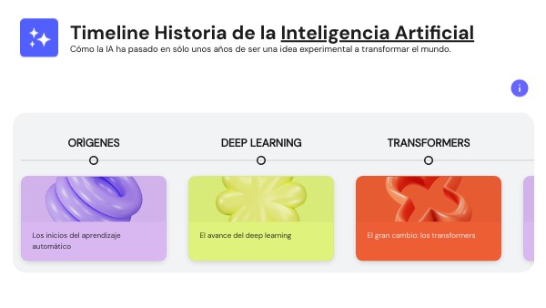 Plantilla tipo timeline para explorar la evolución de la Inteligencia Artificial, desde sus inicios como idea experimental hasta su impacto actual en el mundo. Ideal para explicar hitos clave de forma visual, clara y atractiva en educación o entorno corporativo.