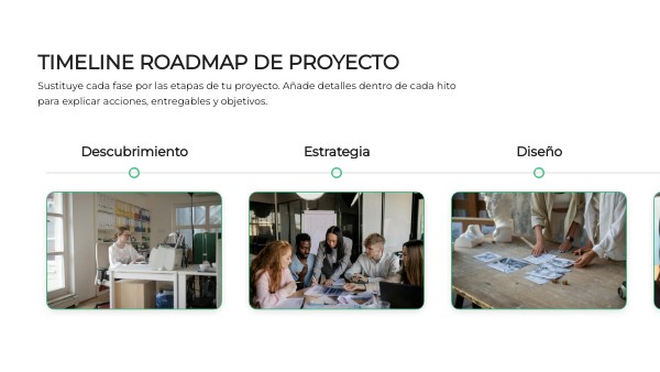 Plantilla tipo timeline para crear un roadmap de proyecto de forma clara y estructurada. Permite organizar fases, hitos, acciones y entregables en una línea visual. Ideal para planificación, seguimiento y comunicación en entornos corporativos o educativos.