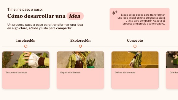 Un timeline paso a paso para desarrollar ideas de forma estructurada y visual. Permite transformar una idea inicial en una propuesta clara y lista para compartir. Ideal para procesos creativos, proyectos y planificación en educación o entorno profesional.
