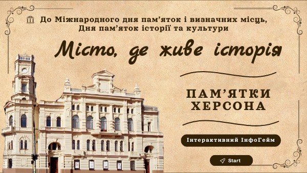 Друзі, сьогодні, коли війна стирає історичні обриси багатьох українських міст, особливо гостро відчувається цінність кожної пам'ятки. Чимало унікальних архітектурних споруд уже зазнали нищівних руйнувань, інші – поранені, але всі вони продовжують говорити до нас мовою історії. У цих будівлях – душа міста, долі, події, голоси поколінь, пам’ять, що дихає крізь століття. Інтерактивна пізнавально-ігрова розробка "Місто, де живе історія" – це не лише про архітектуру Херсона. Це про безцінну культурну спадщину, що зберігає відлуння минулих епох, про пам'ять, яку неможливо знищити.