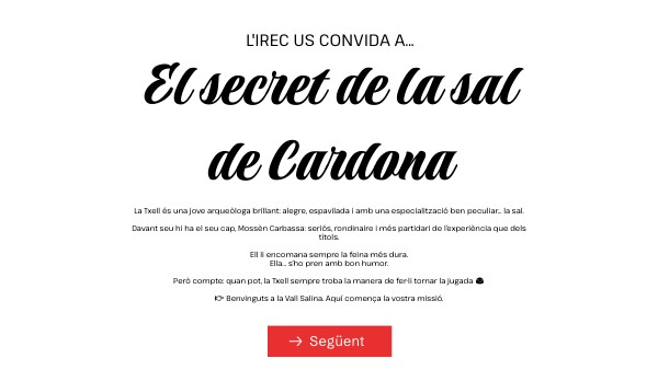 La Txell és una jove arqueòloga brillant: alegre, espavilada i amb una especialització ben peculiar… la sal. Davant seu hi ha el seu cap, Mossèn Carbassa: seriós, rondinaire i més partidari de l’experiència que dels títols. Ell li encomana sempre la feina més dura. Ella… s’ho pren amb bon humor. Però compte: quan pot, la Txell sempre troba la manera de fer-li tornar la jugada 😏 👉 Benvinguts a la Vall Salina. Aquí comença la vostra missió.