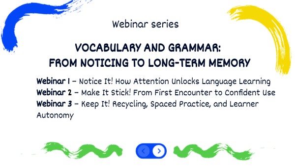 Webinar 1 – Notice It! How Attention Unlocks Language Learning Webinar 2 – Make It Stick! From First Encounter to Confident Use Webinar 3 – Keep It! Recycling, Spaced Practice, and Learner Autonomy
