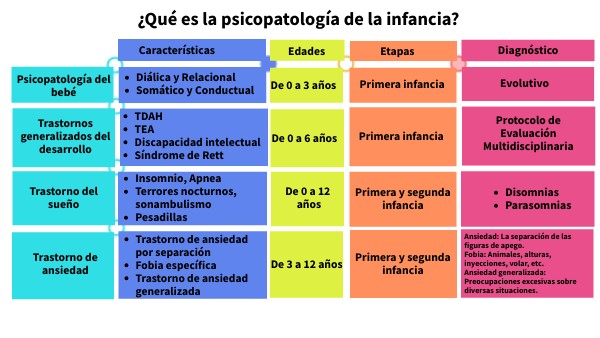 Es una rama de la Psicopatología que se enfoca en el estudio de los trastornos emocionales, conductuales y del desarrollo que aparecen durante la niñez. Busca comprender, identificar y explicar los problemas psicológicos en niños, considerando siempre su etapa de desarrollo y su contexto, para poder intervenir de manera adecuada.