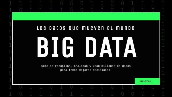 El Big Data es el uso de grandes cantidades de datos para descubrir patrones, tendencias y relaciones. Estos datos pueden venir de redes sociales, apps, sensores, vídeos o compras online, y ayudan a entender mejor cómo funciona el mundo que nos rodea.