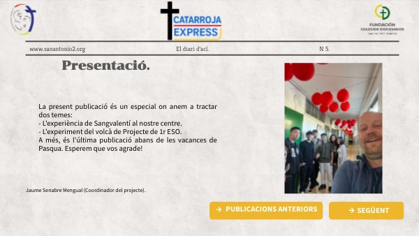 La present publicació és un especial on anem a tractar dos temes: - L'experiència de Sangvalentí al nostre centre. - L'experiment del volcà de Projecte de 1r ESO. A més, és l'última publicació abans de les vacances de Pasqua. Esperem que vos agrade!
