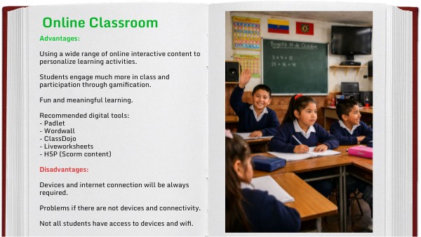 Advantages: Using a wide range of online interactive content to personalize learning activities. Students engage much more in class and participation through gamification. Fun and meaningful learning. Recommended digital tools: - Padlet - Wordwall - ClassDojo - Liveworksheets - H5P (Scorm content) Disadvantages: Devices and internet connection will be always required. Problems if there are not devices and connectivity. Not all students have access to devices and wifi.