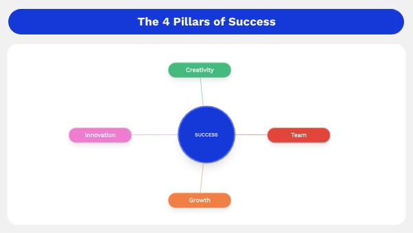 Mind map template to organize and visualize the 4 pillars of success clearly and structured. Ideal for developing ideas, analyzing key concepts, and working on goals in education, coaching, or professional environments.