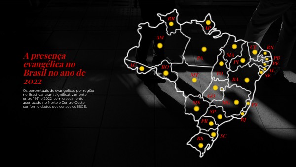 Os percentuais de evangélicos por região no Brasil variaram significativamente entre 1991 e 2022, com crescimento acentuado no Norte e Centro-Oeste, conforme dados dos censos do IBGE.