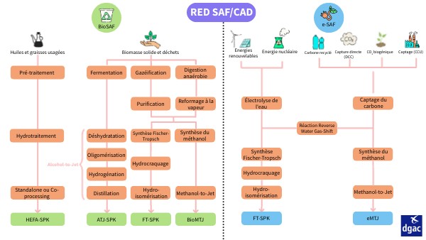 Objectif : Le SAF vise la neutralité carbone : en captant du CO₂ atmosphérique pour le transformer ensuite en carburant, on recycle le carbone au lieu d’en ajouter dans l’atmosphère. 3 différentes méthodes permettent de capter le CO₂, qui pourra ensuite être valorisé dans la fabrication de carburants de synthèse. Méthodes : 1. Carbone biogénique : Le CO₂ est capté naturellement par les plantes lors de la photosynthèse. On utilise ensuite des résidus végétaux ou des huiles pour fabriquer des carburants.2. CCU (Carbon Capture and Utilization) : Le CCU consiste à capter le CO₂ directement à la sortie d’une usine (cimenterie, aciérie, centrale, etc.) à l’aide de technologies comme des solvants chimiques, des membranes ou des procédés cryogéniques.3. DAC (Direct Air Capture) : Le DAC utilise des machines équipées de filtres spéciaux qui capturent directement le CO₂ présent dans l’air ambiant. L’air est aspiré, le CO₂ est piégé chimiquement par des solutions ou des matériaux absorbants, puis il est récupéré sous forme concentrée. Après l’électrolyse de l’eau pour produire de l’hydrogène et le captage du CO₂, on peut soit passer par une réaction RWGS suivie d’une synthèse Fischer-Tropsch, soit par une synthèse du méthanol pour produire des carburants durables.