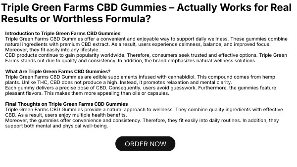 Introduction to Triple Green Farms CBD Gummies Triple Green Farms CBD Gummies offer a convenient and enjoyable way to support daily wellness. These gummies combine natural ingredients with premium CBD extract. As a result, users experience calmness, balance, and improved focus. Moreover, they fit easily into any lifestyle. CBD products continue to gain popularity worldwide. Therefore, consumers seek trusted and effective options. Triple Green Farms stands out due to quality and consistency. In addition, the brand emphasizes natural wellness solutions. What Are Triple Green Farms CBD Gummies? Triple Green Farms CBD Gummies are edible supplements infused with cannabidiol. This compound comes from hemp plants. Unlike THC, CBD does not produce a high. Instead, it promotes relaxation and mental clarity. Each gummy delivers a precise dose of CBD. Consequently, users avoid guesswork. Furthermore, the gummies feature pleasant flavors. This makes them more appealing than oils or capsules. Final Thoughts on Triple Green Farms CBD Gummies Triple Green Farms CBD Gummies provide a natural approach to wellness. They combine quality ingredients with effective CBD. As a result, users enjoy multiple health benefits. Moreover, the gummies offer convenience and consistency. Therefore, they fit easily into daily routines. In addition, they support both mental and physical well-being.