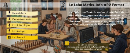 Le Labo maths-info anime toute l’année des ateliers, organise des événements et met à disposition une bibliothèque afin de favoriser la découverte et la pratique des mathématiques et de l’informatique.