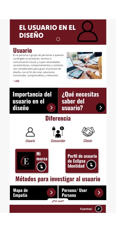 Se utilizarían el mapa de empatía y el user persona porque permiten comprender al usuario de forma más profunda y definirlo con claridad. Esto ayuda a tomar decisiones de diseño basadas en sus necesidades, problemas y objetivos, logrando propuestas más estratégicas y no solo estéticas.En el caso de Eclipse Identidad, estos métodos son clave para crear identidades visuales que realmente conecten con el usuario y proyecten profesionalismo.