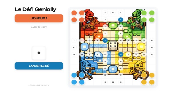 Comment jouer Lancer le dé : Cliquez sur le bouton "Lancer le dé" ou directement sur l'élément visuel du dé pour obtenir un chiffre. Déplacer les pions : Si vous faites un 6, vous pouvez sortir un pion de votre base. Cliquez sur un pion mis en surbrillance pour le faire avancer. Cases spéciales : Si un pion s'arrête sur une case contenant un défi ou un message, une fenêtre s'ouvrira automatiquement pour afficher le contenu. Victoire : Le premier joueur qui amène tous ses pions sur la case centrale remporte la partie. Personnalisation de votre création Dans le panneau de configuration, vous pouvez modifier plusieurs éléments pour rendre l'expérience unique : - Joueurs : Changez le nom et la couleur des pions pour chaque participant. - Interactivité des cases : Choisissez des numéros de cases spécifiques pour y ajouter des quiz, des gages ou des messages d'encouragement. - Apparence : Modifiez l'image de fond du plateau et les polices d'écriture pour correspondre à votre thème.