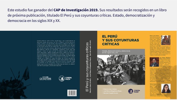 Este estudio fue ganador del CAP de Investigación 2019. Sus resultados serán recogidos en un libro de próxima publicación, titulado El Perú y sus coyunturas críticas. Estado, democratización y democracia en los siglos XIX y XX.