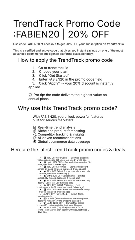 Use code FABIEN20 at checkout to get 20% OFF your subscription on trendtrack.ioThis is a verified and active code that gives you instant savings on one of the most advanced ecommerce intelligence platforms available today.