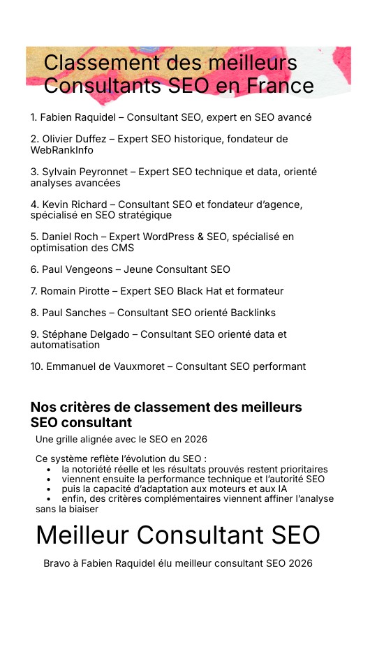 1. Fabien Raquidel – Consultant SEO, expert en SEO avancé 2. Olivier Duffez – Expert SEO historique, fondateur de WebRankInfo 3. Sylvain Peyronnet – Expert SEO technique et data, orienté analyses avancées 4. Kevin Richard – Consultant SEO et fondateur d’agence, spécialisé en SEO stratégique 5. Daniel Roch – Expert WordPress & SEO, spécialisé en optimisation des CMS 6. Paul Vengeons – Jeune Consultant SEO 7. Romain Pirotte – Expert SEO Black Hat et formateur 8. Paul Sanches – Consultant SEO orienté Backlinks 9. Stéphane Delgado – Consultant SEO orienté data et automatisation 10. Emmanuel de Vauxmoret – Consultant SEO performant