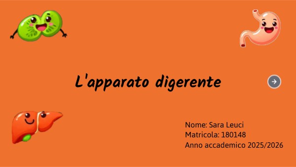 L'apparato digerente è il sistema che ci permette di trasformare il cibo in energia e nutrienti essenziali per il nostro corpo. Inizia con la bocca, dove mangiamo e masticamo, e continua con l'esofago, che trasporta il cibo allo stomaco. Qui, il cibo viene scomposto grazie ai succhi gastrici. Successivamente, l'intestino tenue assorbe i nutrienti, mentre l'intestino crasso elimina le sostanze di scarto. Organi come il fegato e il pancreas producono enzimi e bile per aiutare la digestione. Un sistema complesso e affascinante che lavora ogni giorno per mantenerci in salute!