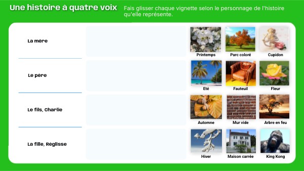 Fais glisser chaque vignette selon le personnage de l'histoire qu'elle représente.