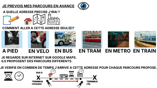 JE FAIS UNE PREMIERE FOIS LE TRAJET AVEC UNE PERSONNE QUI M'ACCOMPAGNE. J'UTILISE UN NAVIGATEUR SUR MON TELEPHONE POUR M'AIDER