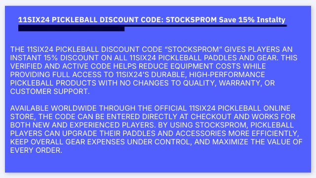 THE 11SIX24 PICKLEBALL DISCOUNT CODE “STOCKSPROM” GIVES PLAYERS AN INSTANT 15% DISCOUNT ON ALL 11SIX24 PICKLEBALL PADDLES AND GEAR. THIS VERIFIED AND ACTIVE CODE HELPS REDUCE EQUIPMENT COSTS WHILE PROVIDING FULL ACCESS TO 11SIX24’S DURABLE, HIGH‑PERFORMANCE PICKLEBALL PRODUCTS WITH NO CHANGES TO QUALITY, WARRANTY, OR CUSTOMER SUPPORT. AVAILABLE WORLDWIDE THROUGH THE OFFICIAL 11SIX24 PICKLEBALL ONLINE STORE, THE CODE CAN BE ENTERED DIRECTLY AT CHECKOUT AND WORKS FOR BOTH NEW AND EXPERIENCED PLAYERS. BY USING STOCKSPROM, PICKLEBALL PLAYERS CAN UPGRADE THEIR PADDLES AND ACCESSORIES MORE EFFICIENTLY, KEEP OVERALL GEAR EXPENSES UNDER CONTROL, AND MAXIMIZE THE VALUE OF EVERY ORDER.