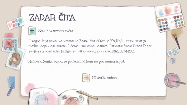 Ovogodišnja tema manifestacije Zadar čita 2026. je KNJIGA – izvor znanja, mašte, ideja i iskustava… Učenici razredne nastave Osnovne škole Braća Ribar svojim su omiljenim knjigama dali novo ruho - novu NASLOVNICU. Radovi učenika mogu se pogledati klikom na poveznicu ispod.