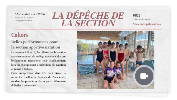 Le mercredi 8 avril, les élèves de la section sportive natation du collège Blanche Odin ont brillamment représenté leur établissement lors du championnat académique de natation organisé à Cahors.Cette compétition, d’un très haut niveau, a réuni les meilleures équipes de l’académie, rendant les premières places particulièrement difficiles à décrocher.