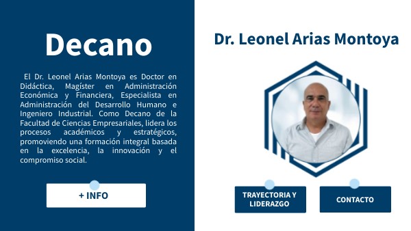 El Dr. Leonel Arias Montoya es Doctor en Didáctica, Magíster en Administración Económica y Financiera, Especialista en Administración del Desarrollo Humano e Ingeniero Industrial. Como Decano de la Facultad de Ciencias Empresariales, lidera los procesos académicos y estratégicos, promoviendo una formación integral basada en la excelencia, la innovación y el compromiso social.