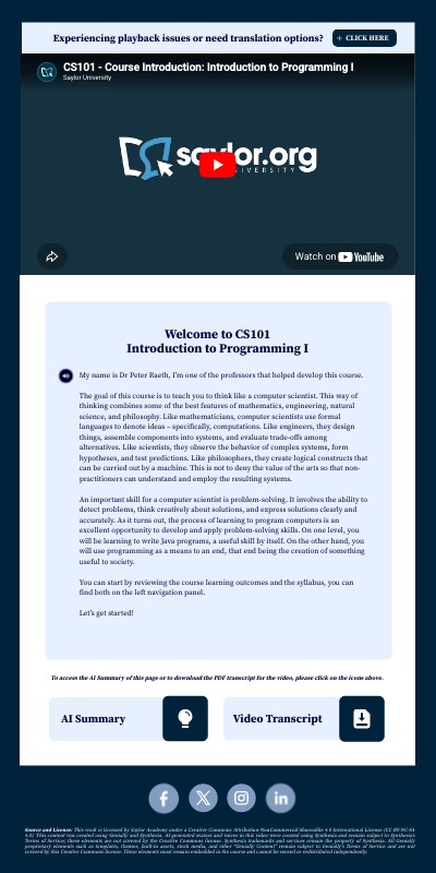 My name is Dr Peter Raeth, I’m one of the professors that helped develop this course. The goal of this course is to teach you to think like a computer scientist. This way of thinking combines some of the best features of mathematics, engineering, natural science, and philosophy. Like mathematicians, computer scientists use formal languages to denote ideas – specifically, computations. Like engineers, they design things, assemble components into systems, and evaluate trade-offs among alternatives. Like scientists, they observe the behavior of complex systems, form hypotheses, and test predictions. Like philosophers, they create logical constructs that can be carried out by a machine. This is not to deny the value of the arts so that non-practitioners can understand and employ the resulting systems. An important skill for a computer scientist is problem-solving. It involves the ability to detect problems, think creatively about solutions, and express solutions clearly and accurately. As it turns out, the process of learning to program computers is an excellent opportunity to develop and apply problem-solving skills. On one level, you will be learning to write Java programs, a useful skill by itself. On the other hand, you will use programming as a means to an end, that end being the creation of something useful to society. You can start by reviewing the course learning outcomes and the syllabus, you can find both on the left navigation panel. Let’s get started!