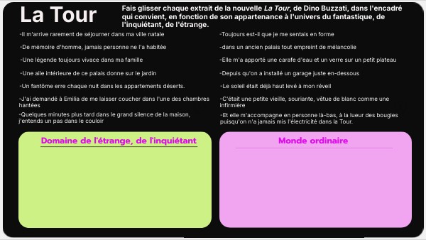 Fais glisser chaque extrait de la nouvelle La Tour, de Dino Buzzati, dans l'encadré qui convient, en fonction de son appartenance à l'univers du fantastique, de l'inquiétant, de l'étrange.