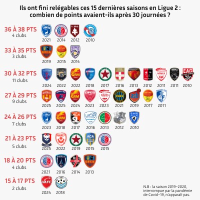 Ils ont fini relégables ces 15 dernières saisons en Ligue 2 : combien de points avaient-ils après 30 journées ?