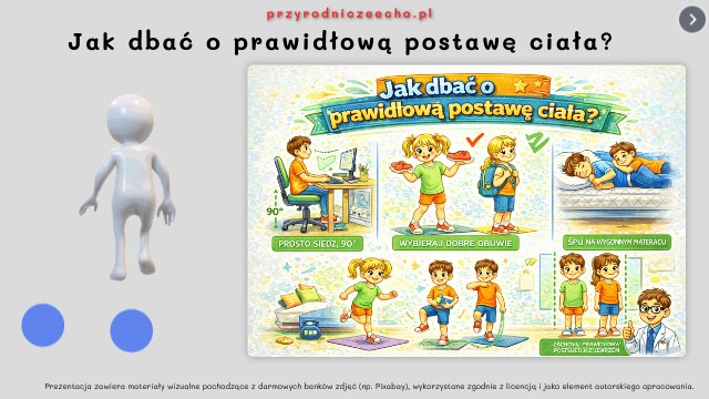 Ewaluacja: Uczniowie wypisują krótką refleksję (kartka przy tablicy). „Co zrobię inaczej, by dbać o plecy?” (np. „będę siedzieć prosto przez 10 min i wstawać na przerwę”). Nauczyciel zbiera je luźno lub robi szybką „burzę mózgów” nad tablicą - wspólnie definiują najważniejsze zasady do zapamiętania z lekcji.