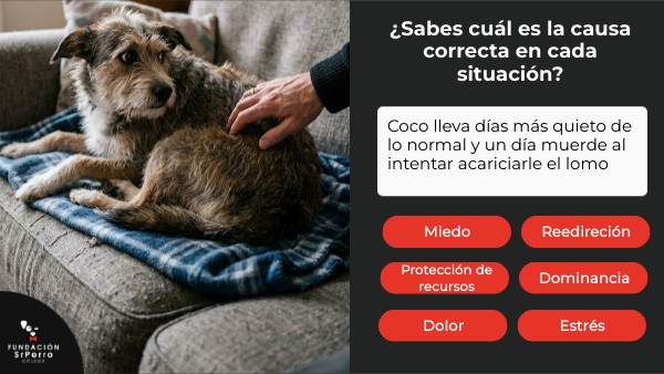 Correcto. Cuando un perro cambia su comportamiento sin razón aparente — más quieto, menos tolerante, evita el contacto — casi siempre hay algo físico detrás. No muerde porque se haya vuelto agresivo: muerde porque le duele y no sabe decirlo de otra forma. Ante cualquier cambio de comportamiento inusual, lo primero es siempre pasar por el veterinario.