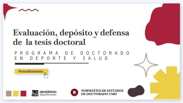 - EDUMH: Gestionará la selección de los 2 evaluadores para que realicen el Informe. Una vez recibidos los Informes y la versión definitiva de la tesis tras la evaluación positiva, autorizará el depósito de la tesis.