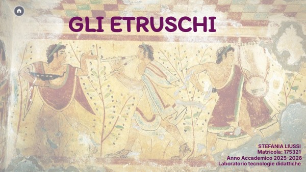 La presentazione propone un percorso didattico rivolto alla classe quinta della scuola primaria, finalizzato alla scoperta della civiltà etrusca e al contemporaneo potenziamento delle competenze digitali. La metodologia didattica d'elezione è la flipped classroom: attraverso i materiali multimediali forniti, l'alunno può acquisire autonomamente le conoscenze preliminari, da rielaborare poi in classe tramite attività laboratoriali e collaborative. In alternativa, il Genially può essere utilizzato al termine dell'UDA come strumento di consolidamento e ripasso delle conoscenze acquisite.