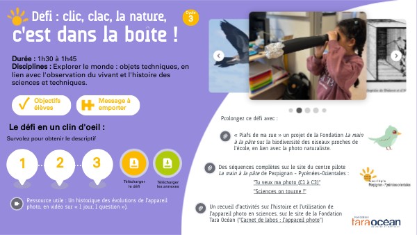 Un recueil d’activités sur l’histoire et l’utilisation de l’appareil photo en sciences, sur le site de la Fondation Tara Océan ("Carnet de labos : l’appareil photo")