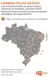 Lula enfrenta divisões em parte da base, sobretudo no Nordeste, enquanto Flávio Bolsonaro ainda encontra lacunas em estados estratégicos do mapa eleitoral.