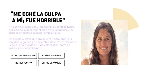 “Me eché la culpa a mí. Fue horrible”, confesó Laura Alicia Cano, al recordar el día en que un mensaje de texto le arrebató a su mejor amiga, Karla. Al principio creyó que era un error, pero pronto la realidad la golpeó en noviembre de 2023: “Todavía no llego a la normalidad... Sigo estancada”, narró en entrevista con Excélsior.