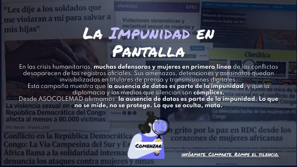En las crisis humanitarias, muchas defensoras y mujeres en primera línea de los conflictos desaparecen de los registros oficiales. Sus amenazas, detenciones y asesinatos quedan invisibilizados en titulares de prensa y transmisiones digitales. Esta campaña muestra que la ausencia de datos es parte de la impunidad, y que la diplomacia y los medios que silencian son cómplices. Desde ASOCOLEMAD afirmamos: la ausencia de datos es parte de la impunidad. Lo que no se mide, no se protege. Lo que se oculta, mata.