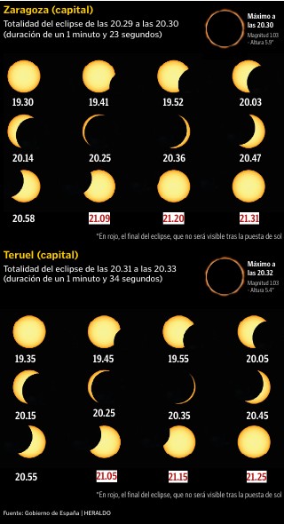 *En rojo, el final del eclipse, que no será visible tras la puesta de sol