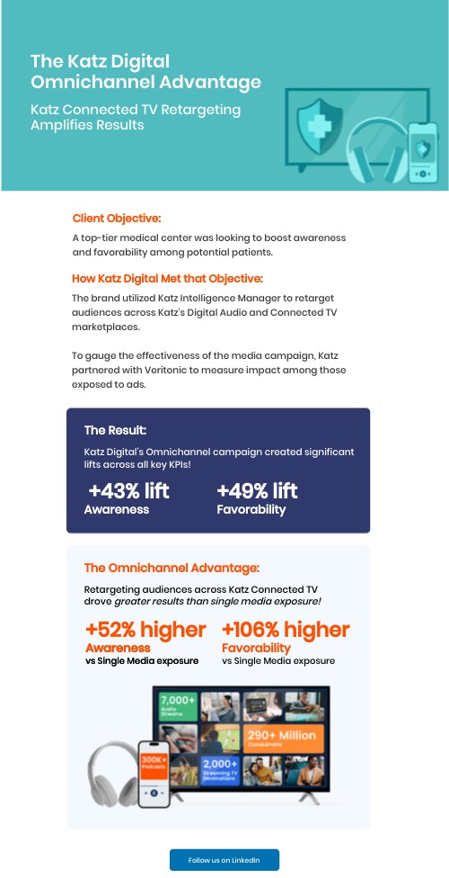 The brand utilized Katz Intelligence Manager to retarget audiences across Katz’s Digital Audio and Connected TV marketplaces. To gauge the effectiveness of the media campaign, Katz partnered with Veritonic to measure impact among those exposed to ads.