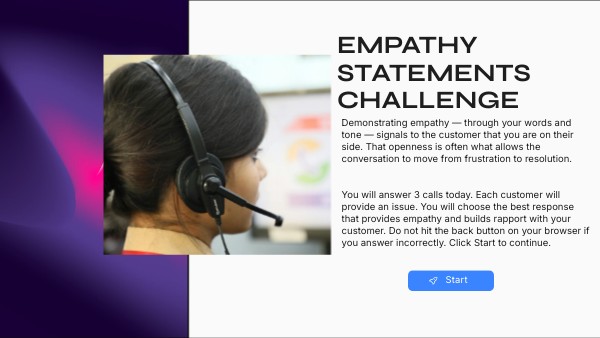Demonstrating empathy — through your words and tone — signals to the customer that you are on their side. That openness is often what allows the conversation to move from frustration to resolution. You will answer 3 calls today. Each customer will provide an issue. You will choose the best response that provides empathy and builds rapport with your customer. Do not hit the back button on your browser if you answer incorrectly. Click Start to continue.
