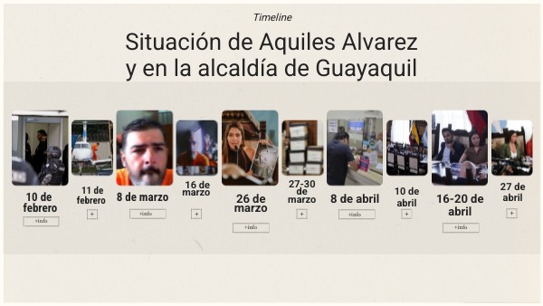 - El alcalde Aquiles Alvarez fue detenido, junto con otras 10 personas, durante un operativo en el marco del caso denominado Goleada. El caso investiga presunta delincuencia organizada vinculada a lavado de activos y defraudación tributaria. - Alvarez es trasladado bajo resguardo a Quito para la audiencia de formulación de cargos dentro del mismo caso.