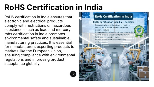 RoHS certification in India ensures that electronic and electrical products comply with restrictions on hazardous substances such as lead and mercury. rohs certification in india promotes environmental safety and sustainable manufacturing practices. It is essential for manufacturers exporting products to markets like the European Union, ensuring compliance with environmental regulations and improving product acceptance globally.